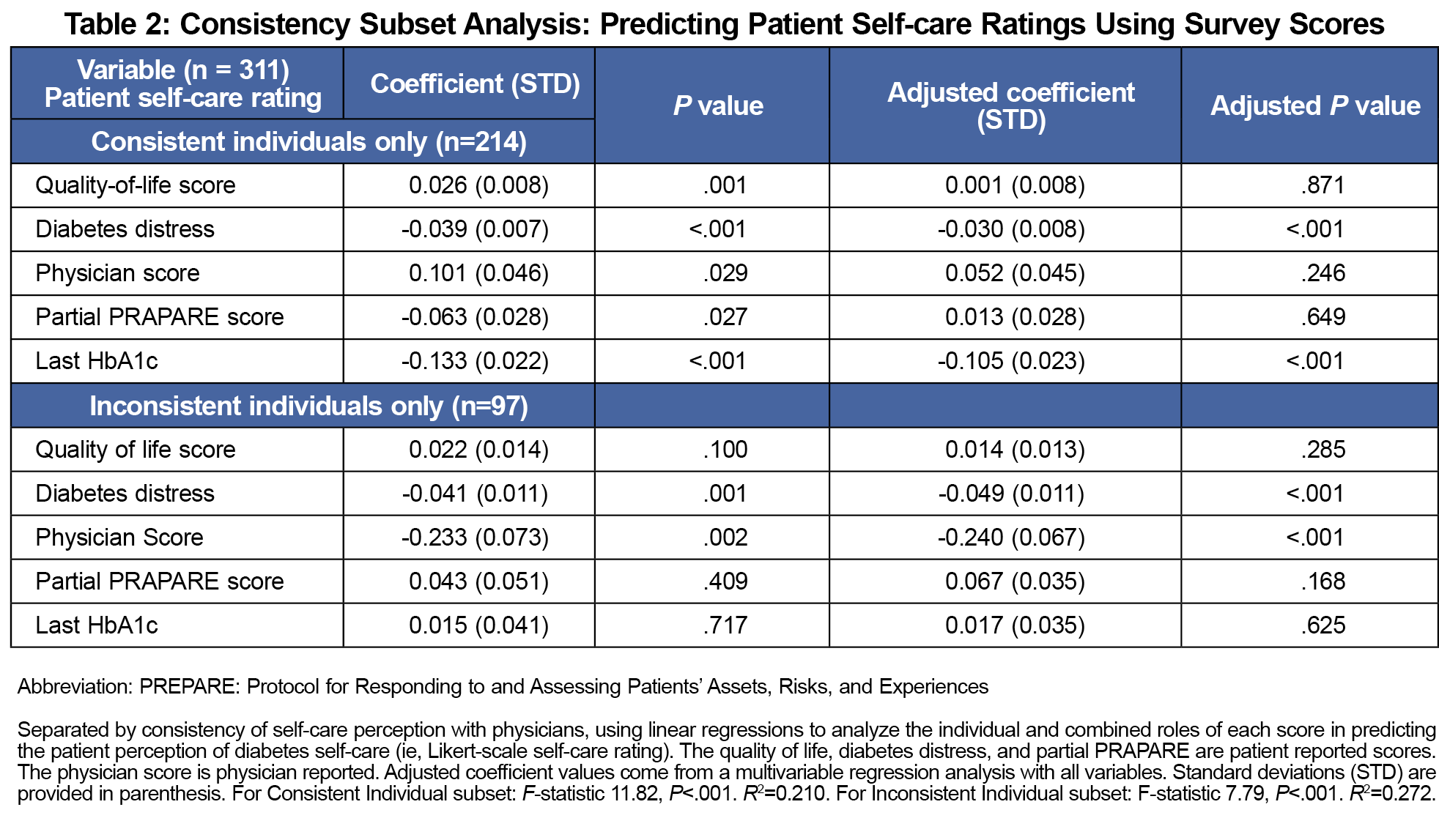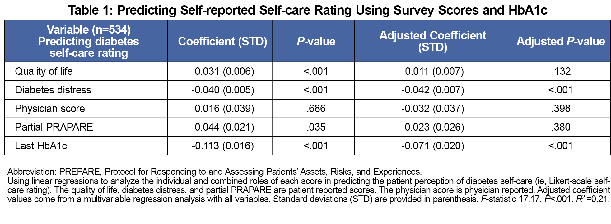 Results: There was a lack of consistency in self-care perception between patients and physicians 31.2% of the time. Patient self-care perception was best predicted by the patients’ diabetes distress scores (P<.001) and last HbA1c (P<.001).