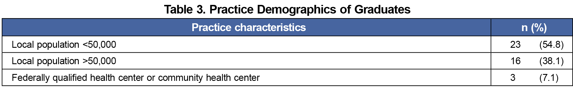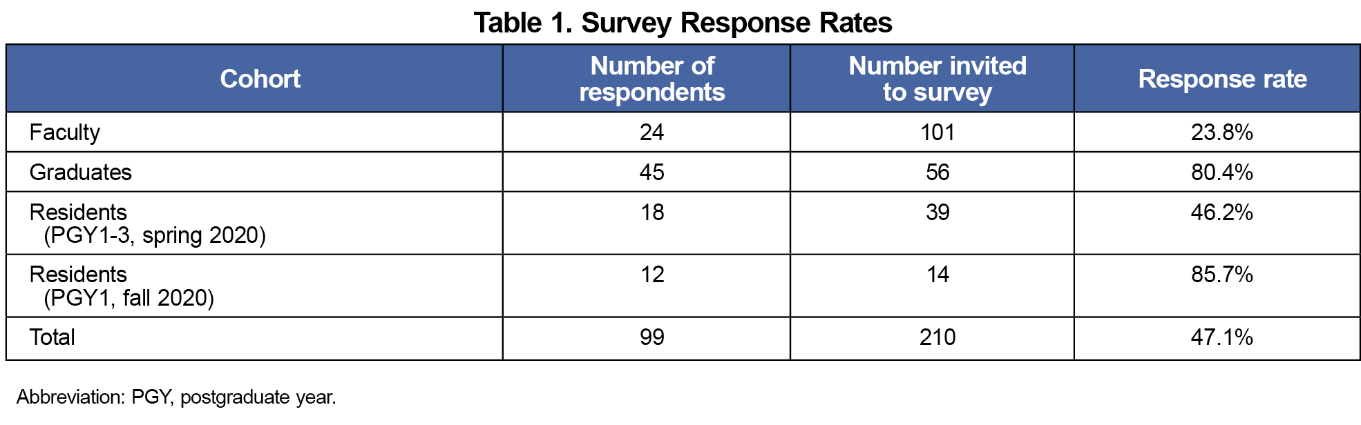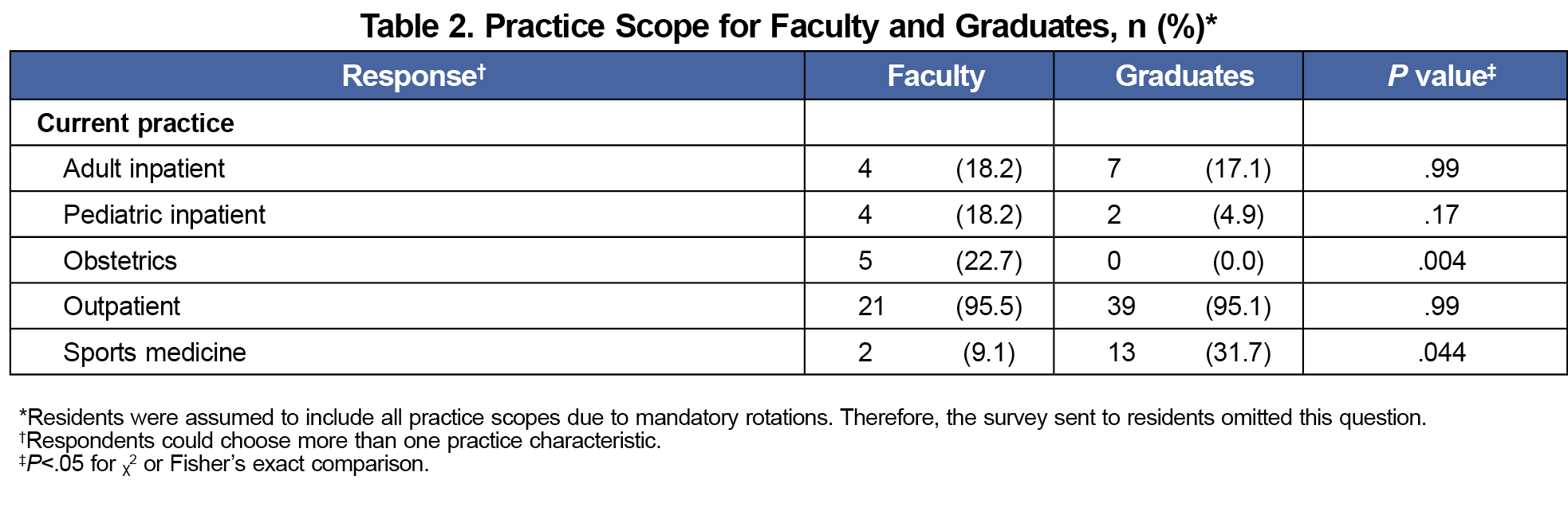 The overall survey response rate was 47.1% (Table 1). Responder characteristics are reported in Tables 2 and 3. Most respondents practiced outpatient medicine. Only 22.7% of faculty and no graduates practiced obstetrics.