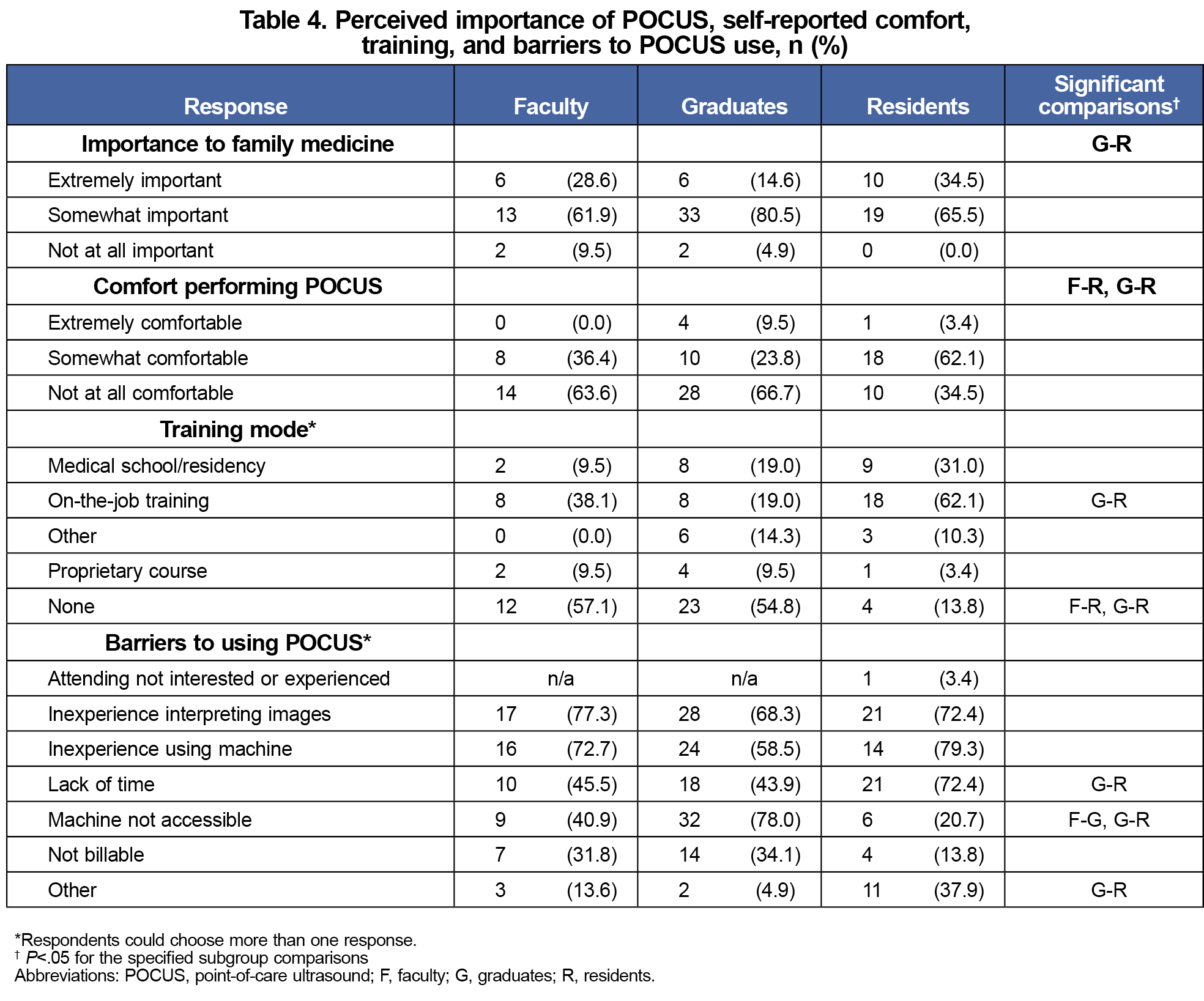 Most participants (95.6%) agreed that POCUS was somewhat or extremely important to family medicine (Table 4). Very few respondents (5.4%) reported being extremely comfortable using POCUS. Most residents reported being somewhat comfortable, while most faculty and graduates were not at all comfortable. More than half of faculty and graduates reported no POCUS training, compared with only 13.8% of residents. More residents (62.1%) than faculty (38.1%) or graduates (19.0%) reported on-the-job training.