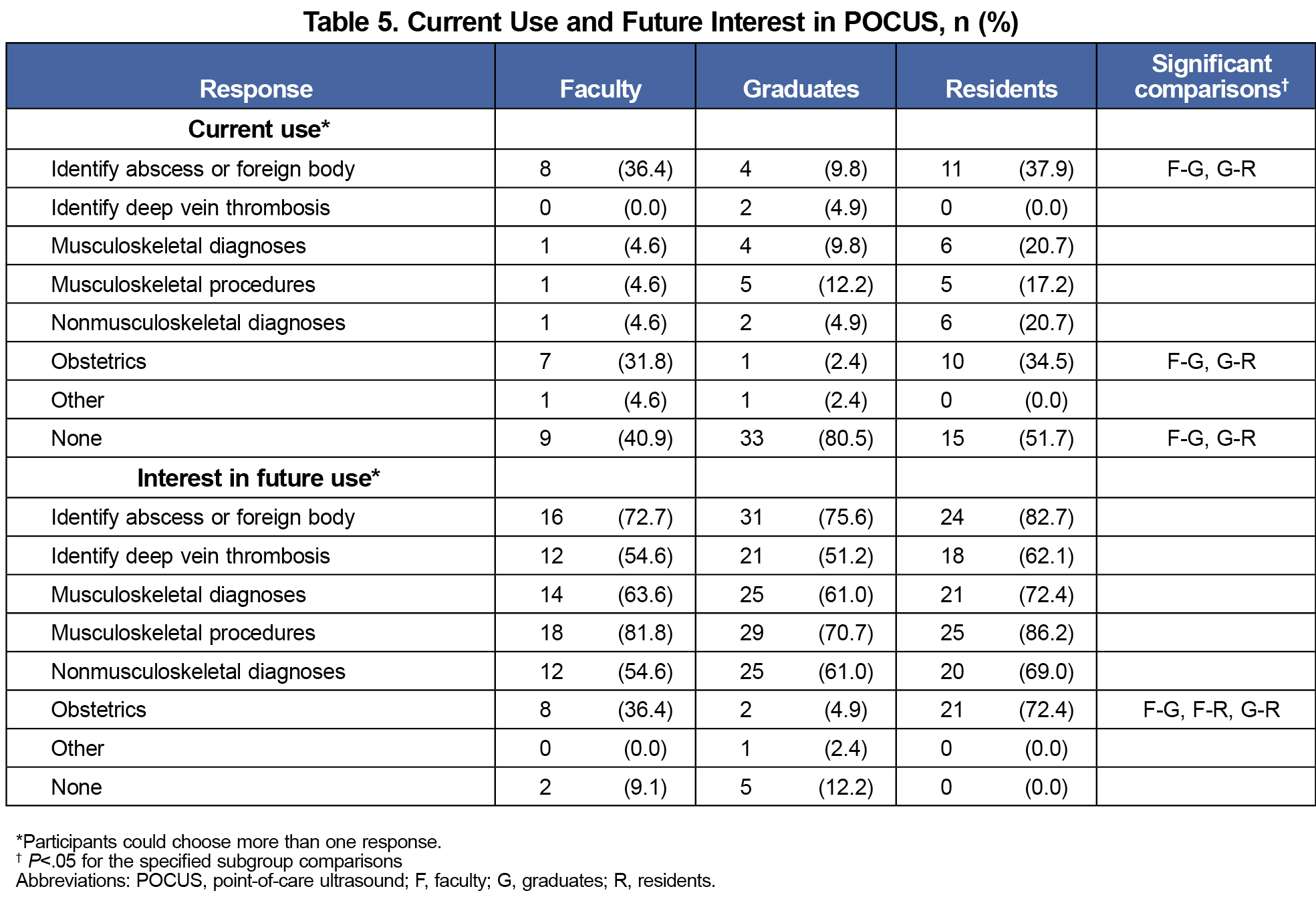 More than 80% of graduates reported no current POCUS use, compared with 40.9% of faculty and 51.7% of residents (Table 5). Approximately one-third of faculty and residents used POCUS for obstetrics, compared with 2.4% of graduates. More than one-third of residents and faculty used POCUS to identify an abscess or foreign body compared to 9.8% of graduates.
