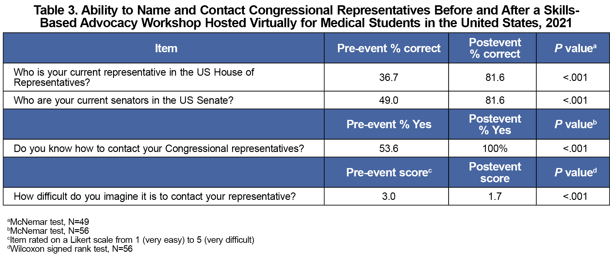 Before the LWL, 36.7% of participants correctly identified their representative, and 49.0% of participants correctly identified both of their senators (Table 3). Afterward, 81.6% were correct (P<.001) for both questions. After the event, participants also showed a statistically significant decrease in perceived difficulty of the skill (z=–759, P<.001).