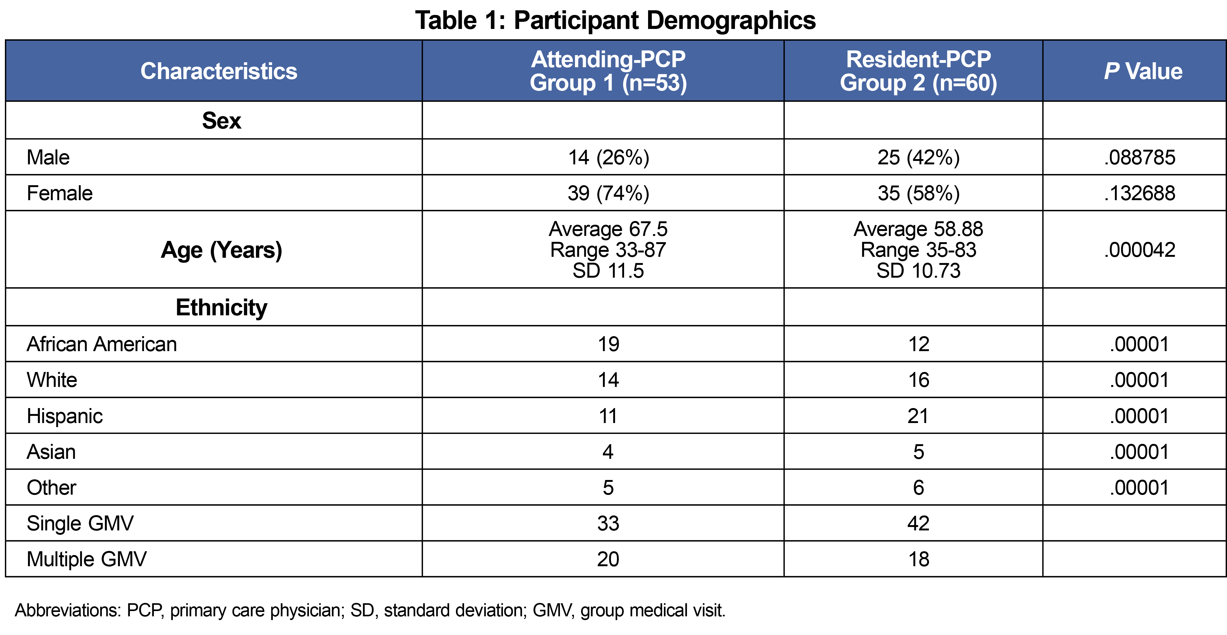 GMV patients receiving care from FM residents had improved LDL, TG, HDL, and HbA1C. The difference in metrics between the groups may be attributed to the team-based diabetes education received by FM residents. Residents trained in the GMV model of care may have gained additional perspectives of the complexity of patient experience and confidence in their ability to teach and communicate.7 The mean baseline HbA1c was lower in group 1 and the average age of patients was greater. Consequently, group 1 patients may have had less stringent HbA1C goals. Study limitations were that insurance status and language preference was not retrievable and some patients attended multiple GMV (n=39), while others attended a single GMV(n=74). However, the number of patients attending multiple GMV was similar in both groups (Table 1). Patient scheduling conflicts, insurance status, and lack of follow-up obtaining labs posed challenges. Consequently, an office-based community health worker (CHW) contacted patients with HbA1C ≥9% to screen for barriers. Approximately 50% of these patients preferred Spanish as a primary language and 35% were uninsured. Previous literature cited communication and scheduling as barriers to resident participation in GMV.5 Therefore, evening office hours were replaced with the GMV to ensure participation. Residents invited their patients, which facilitated continuity and contributed to participant willingness to express goals.