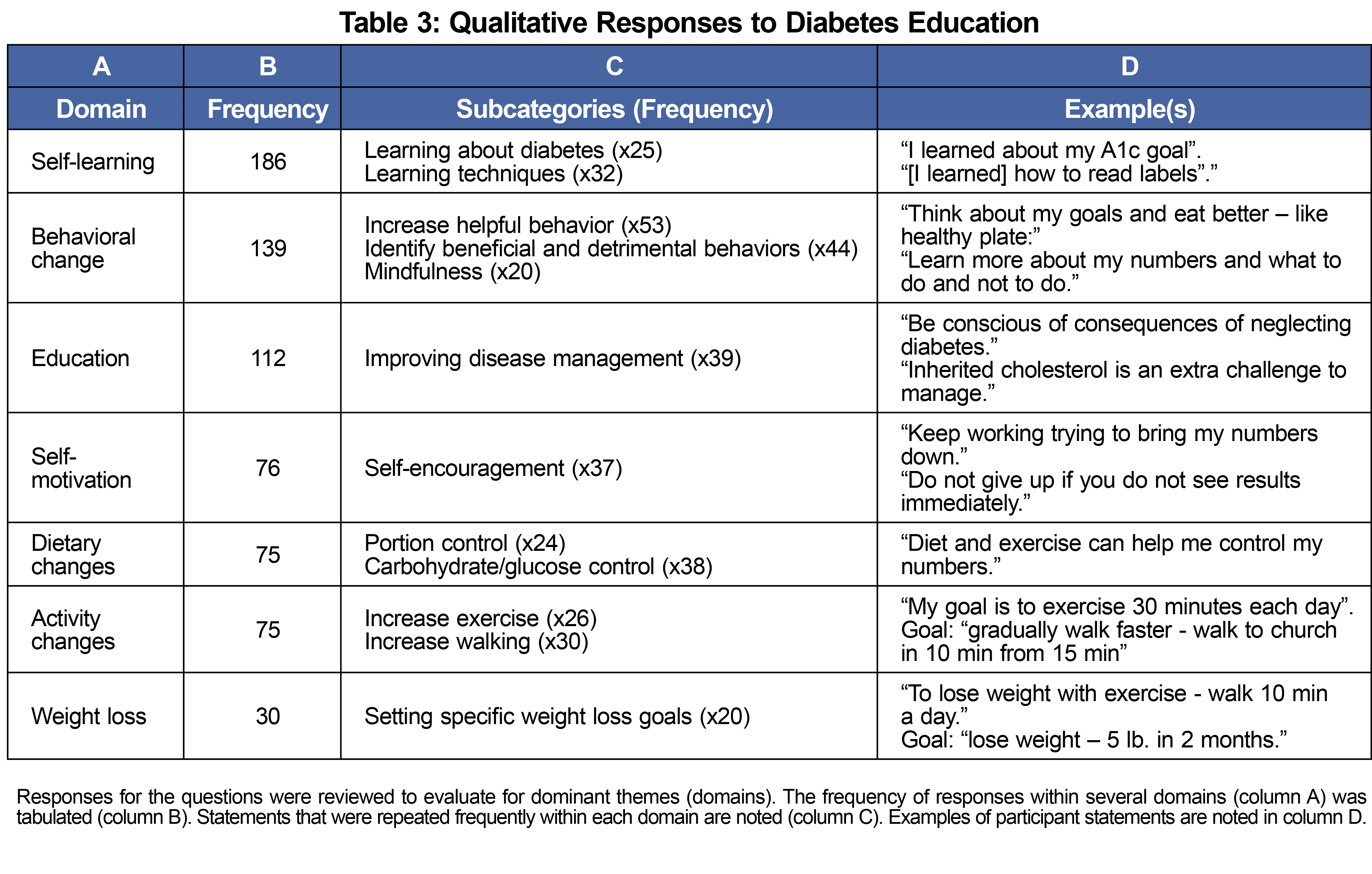 A survey generated by the NP/CDCES was administered to patients to assess patient-perceived value on a scale of 1 to 5, lowest to highest. Questions asked included “Was the topic useful?”, “Was the speaker knowledgeable?”, and “Was the program well-organized?" Patients listed two learned concepts and set two goals. We analyzed qualitative responses using a modified version of the consensual qualitative research method. The study was granted an exemption by Atlantic Health System’s institutional review board.